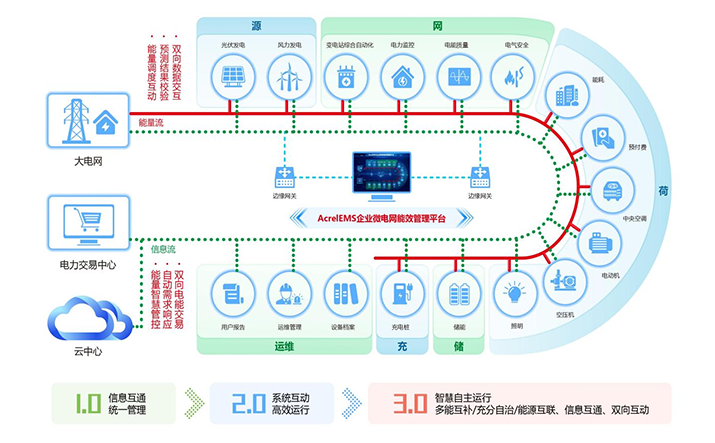 簡介:1.概述 通過在源、網、荷、儲、充的各個關鍵節(jié)點安裝監(jiān)測、分析、保護、治理裝置, 通過高性能邊緣計算網關采集數據并上傳至企業(yè)微網平臺。平臺根據新的電網價格、 用電負荷、電網調度指令等情況,調整各系統(tǒng)控制策略并遠程下發(fā),使企業(yè)微電網始終高效穩(wěn)定運行, 降低企業(yè)用電成本,實現能源互聯(lián)、信息互動。 2.應用場所 適用于各行業(yè)企業(yè)內部微電網管理系統(tǒng)的新建、擴建、改建等項目。 3.平臺結構 3.平臺功能 安科瑞AcrelEMS企業(yè)微電網能效管理平臺融合了電力監(jiān)控、電氣安全、照明控制、能源管控、充電樁運營管理、分布式光伏監(jiān)測、儲能管理、設備臺賬、運維管理等功能,通過一個平臺、一個APP整體的對企業(yè)用電進行集中監(jiān)控、統(tǒng)一調度、統(tǒng)一運維,并且根據當地供電部門錯峰避峰計劃提前為企業(yè)制定錯峰避峰方案和預警,滿足企業(yè)